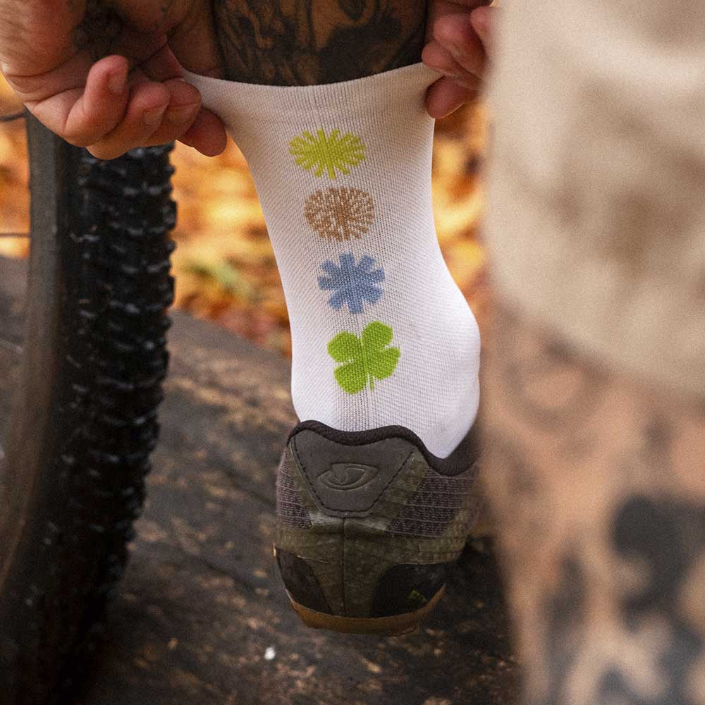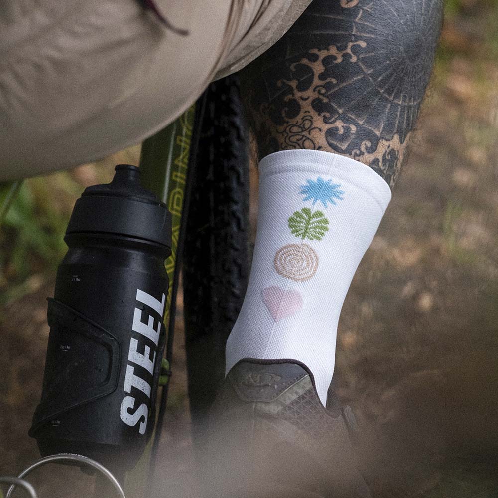 Ce modèle de chaussette est le fruit d’une collaboration unique entre Steel, et la direction artistique du studio de création bordelais Ateliers Malinowsky. Nicolas Malinowsky nous propose ici une interprétation de notre crédo “Alors, ça roule ?”, avec des éléments figuration ronds symbolisant le cercle, et donc la roue. Inspirés des éléments et de la nature, ces dessins sont assemblés en deux colonnes distinctes, toutes deux situées à l’arrière de chaque chaussette. Un petit twist original seulement visible de l’arrière.