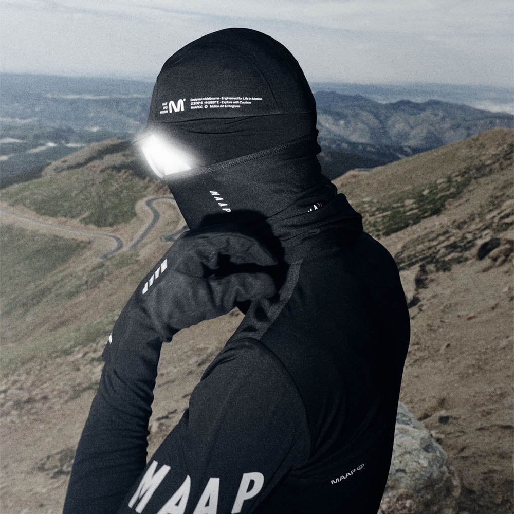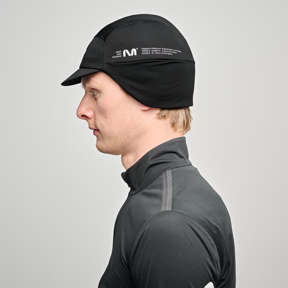 The Maap Apex Deep Winter Cap Black combines waterproof and windproof Polartec® Power Shield™ fabric with an inner fleece grid for breathable warmth.