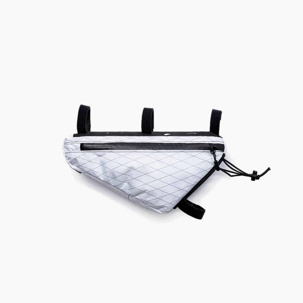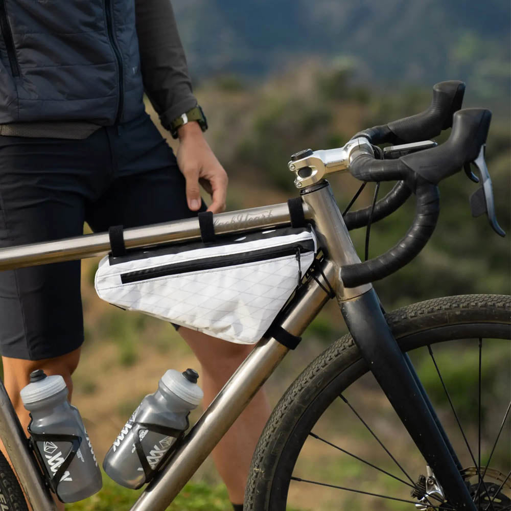 The Mission Workshop Slice White Frame Bag VX is a lightweight and durable frame bag that maximizes storage without getting in the way of your knees. Designed to fit perfectly on the front triangle of road and gravel frames, it's sized to work with two bottle cages so you don't have to sacrifice storage for hydration.
