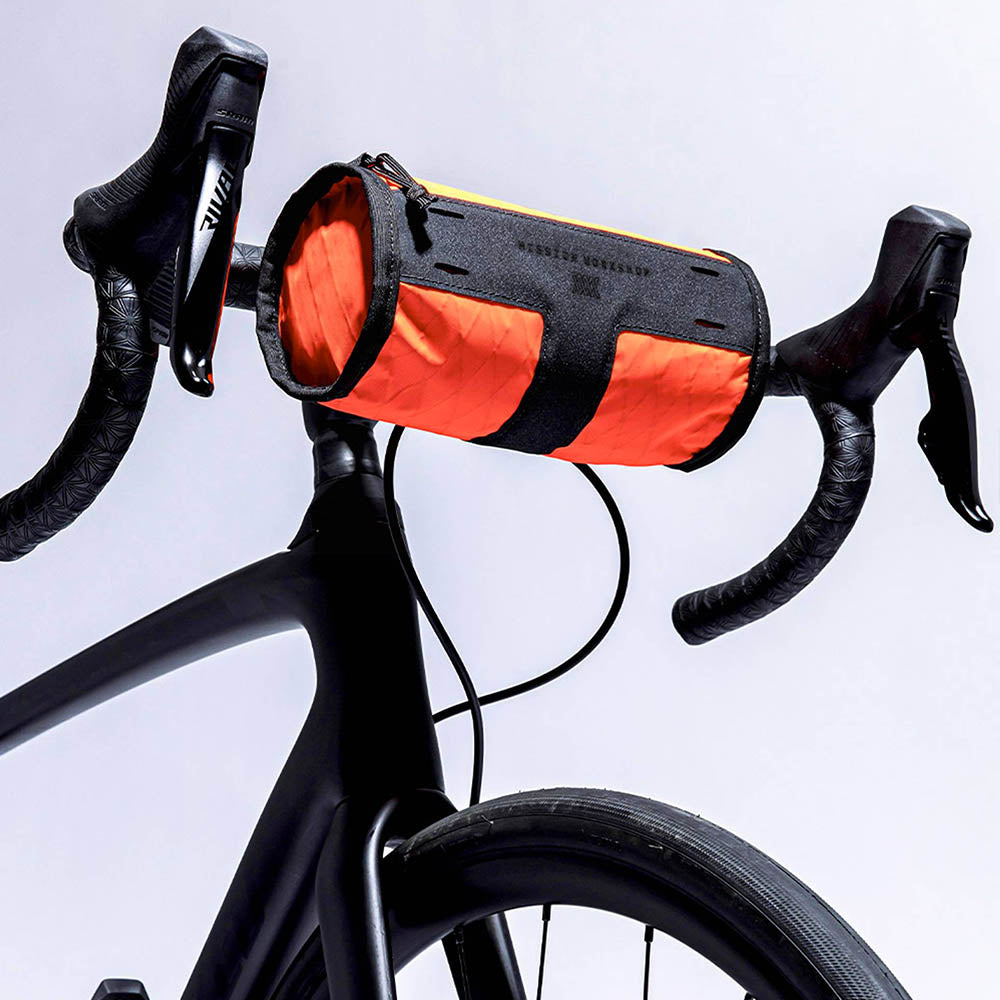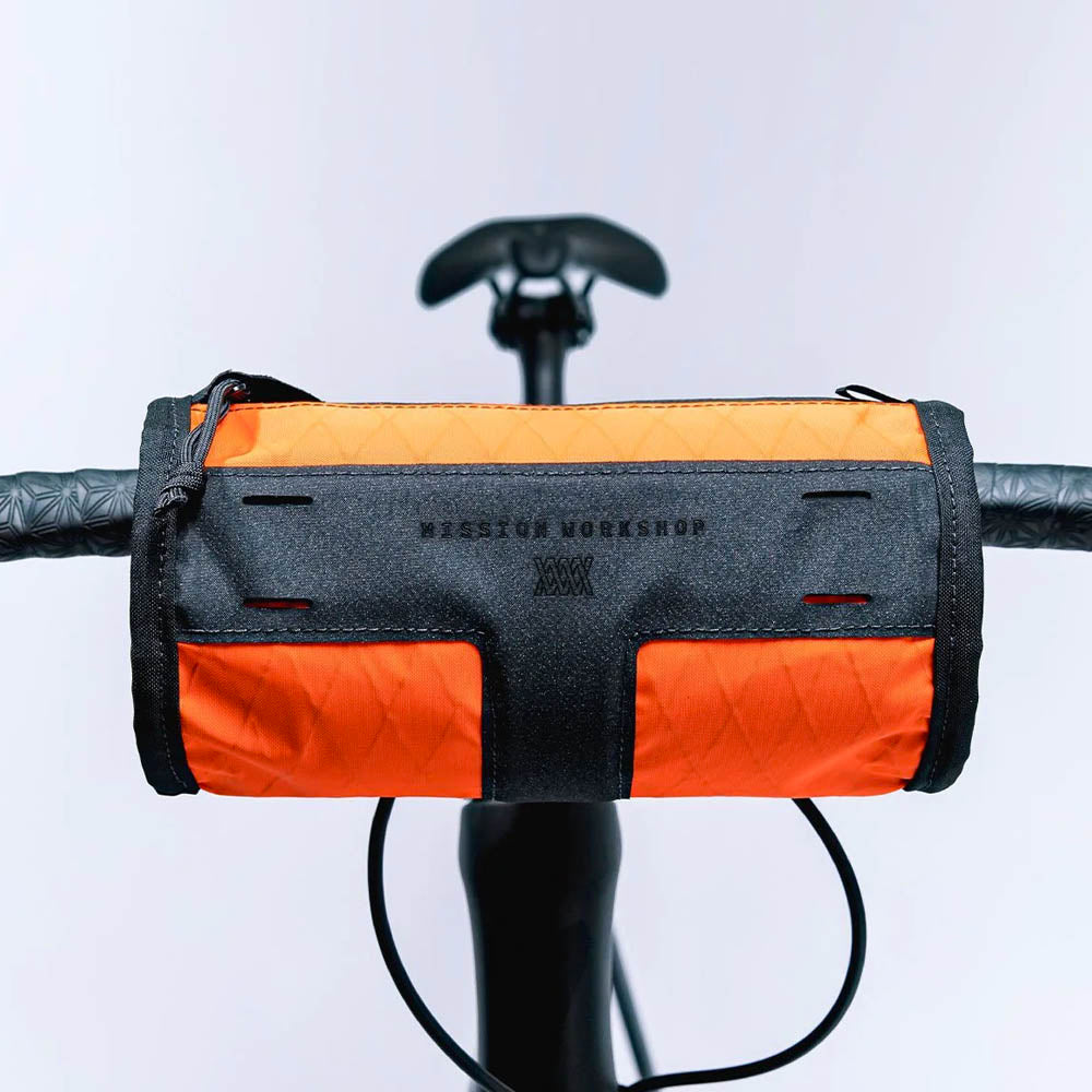The Mission Workshop Toro Handlebar Bag Orange VX goes to any road bike, mountain bike, or gravel bike handlebar. Take your ride essentials with you.