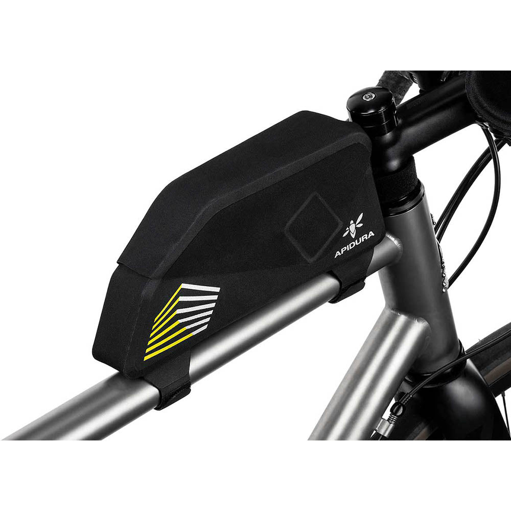 The Apidura Racing 1L top tube bag is a compact, waterproof bag with a magnetic flap closure.