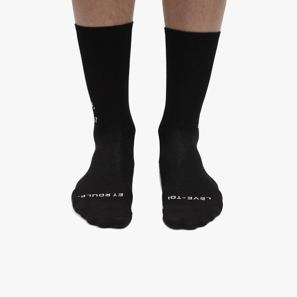 The Steel Alors ça roule black socks are a Steel design featuring the famous phrase "Alors ça roule" on the outside of each sock so everyone can see it. To add a motivational touch, we've printed the phrase "Lève-toi et roule." at the toes, which you can read before putting on your shoes.