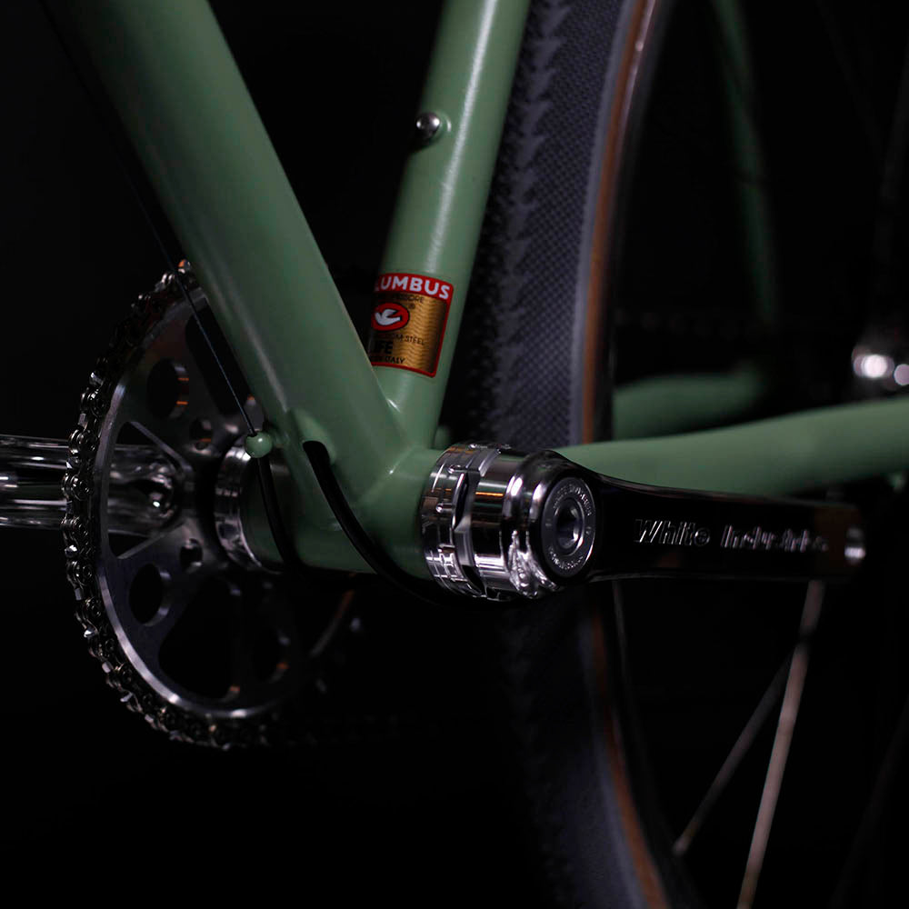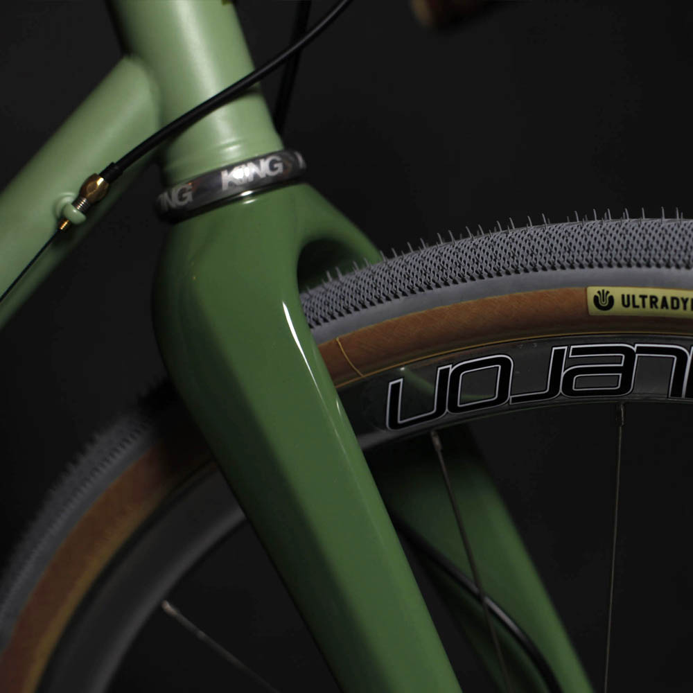 This particular model is the first version of our Gravel bikes. It's unique thanks to the chromed components chosen to complement the "liken" color of the frame. The Columbus carbon fork has also been customized in this way.