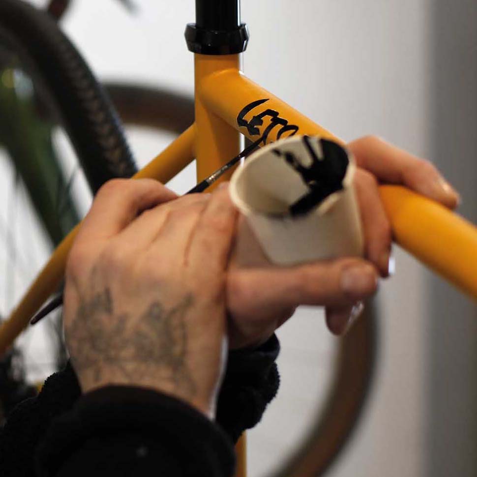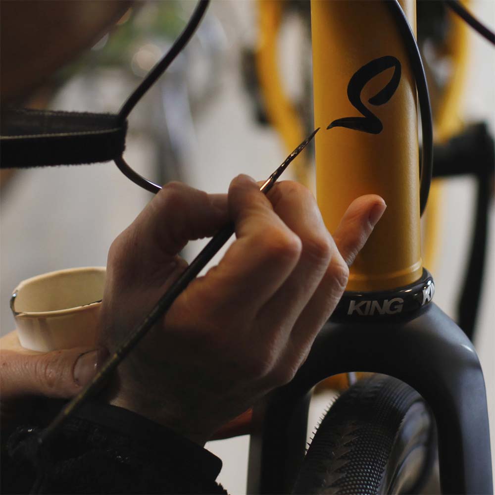 Les cadres sont ensuite peints avec une peinture époxy choisie pour sa résistance à l'abrasion et aux éclats de pierres. Enfin, un peintre en vitrine se déplace chez Steel pour une personnalisation unique au pinceau.
