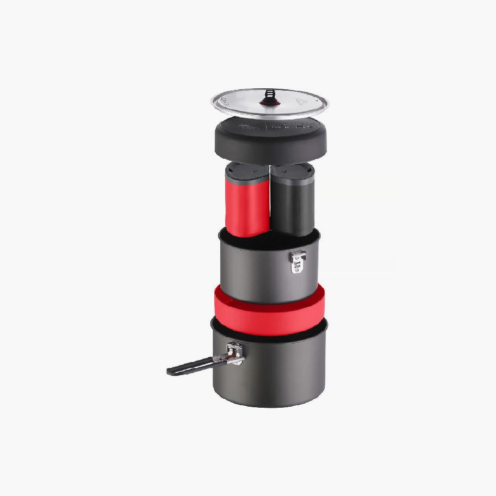Le système fermé mesure 19,7 x 12,7 cm, et comprend un casserole anti-adhésive de 1,5 L et une seconde de 2.5L, deux assiettes, deux gobelets, un couvercle passoire, un poignée de casserole, deux surfaces de cuisson, deux assiettes en polypropylène, un gobelet isolant en polypropylène,